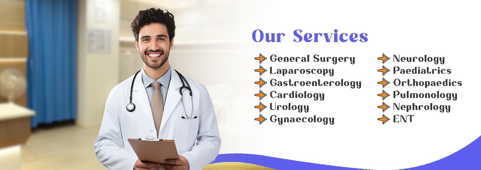 We offer expert care across a wide range of specialities including General Surgery, Laparoscopy, Gastroenterology, Cardiology, Urology, Gynaecology, Neurology, Paediatrics, Orthopaedics, Pulmonology, Nephrology, and ENT — ensuring complete and compassionate healthcare for all.